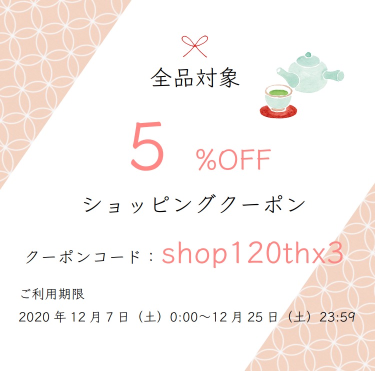 購入画面でクーポンコード【 shop120thx3 】のご入力で適用されます。